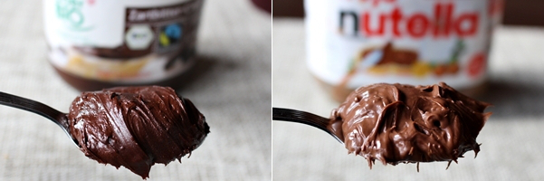 Po otwarciu szklanego, 400g słoika, poczułam przyjemnie czekoladowy zapach, kojarzący mi się z czymś konkretnym, ale dopiero po spróbowaniu zdałam sobie sprawę, że jest to zapach deseru sojowego o smaku gorzkiej czekolady tej samej firmy. Krem jest gęsty, ale gęstość ta różni się od nutellowej - jest mniej mazista, a wbicie się w masę łyżeczką pozostawia wyraźniejsze ślady niż w przypadku Nutelli, bardziej "ciągnącej się" przy nabieraniu, co może trochę zobrazuje poniższe zdjęcie porównawcze...